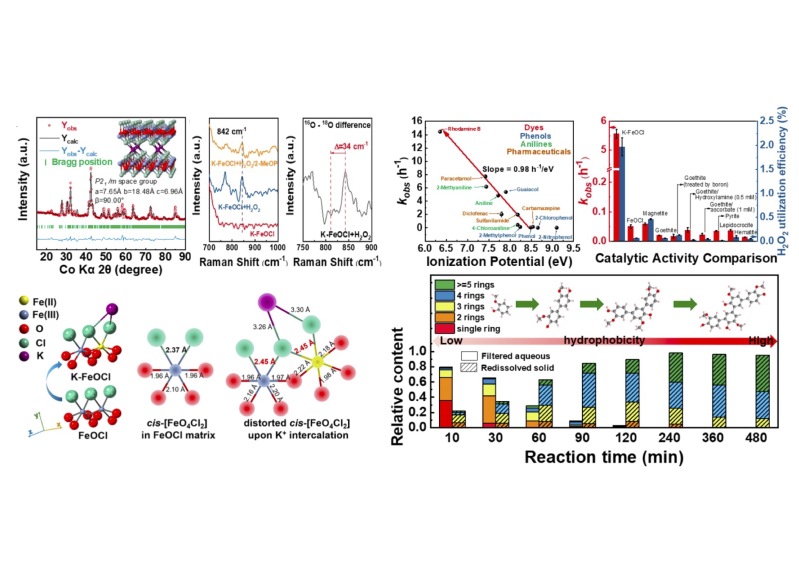 氧氧键活化产生活性氧物种的过程受多相界面金属配位环境影响显著,是生物有氧氧化、自然界氧化还原作用、酶催化和精细选择性氧化的核心微观过程之一。人们利用仿生大环配体,界面金属载体强相互作用,沸石、碳基或硅基骨架限域作用等发展了诸多高效催化氧化体系。2013年,问鼎手机版(中国)相关团队发展了FeOCl这一高效多相Fenton催化剂(J. Am. Chem. Soc. 2013,135, 43, 16058–16061),高效催化过氧化氢均裂产生羟基自由基。此次,借助FeOCl结构性Cl···Cl范德华层的特殊存在,研究人员通过氧化还原插层,在范德华层间引入碱金属离子,调控FeOCl的铁配位中心微环境,通过插层前体、插层时间等因素的精准优化,在钾离子插层的情况下获得了一种全新的畸变顺式双核FeO4Cl2固相铁配位构型,并通过X射线衍射精修、X射线光电子能谱、穆斯堡尔谱、原位紫外可见光谱、原位拉曼光谱等多种手段在原子尺度解析了上述结构演变过程和新构型下过氧化氢活化路径的切换。过氧化氢异裂产生Fe(IV)=O非自由基活性物种,可诱导染料、药物、酚、胺类多种有机物的氧化偶联腐质化过程,将溶解态有机污染物转变为颗粒絮体,结合过滤可实现有机污染物和总有机碳的高效去除,偶联速率与底物的离子化能存在线性关系。研究团队还通过同位素KIE测试、电子顺磁共振证明了反应过程中涉及底物在K-FeOCl表面的质子耦合电子转移和液相主体中的自由基偶联过程。